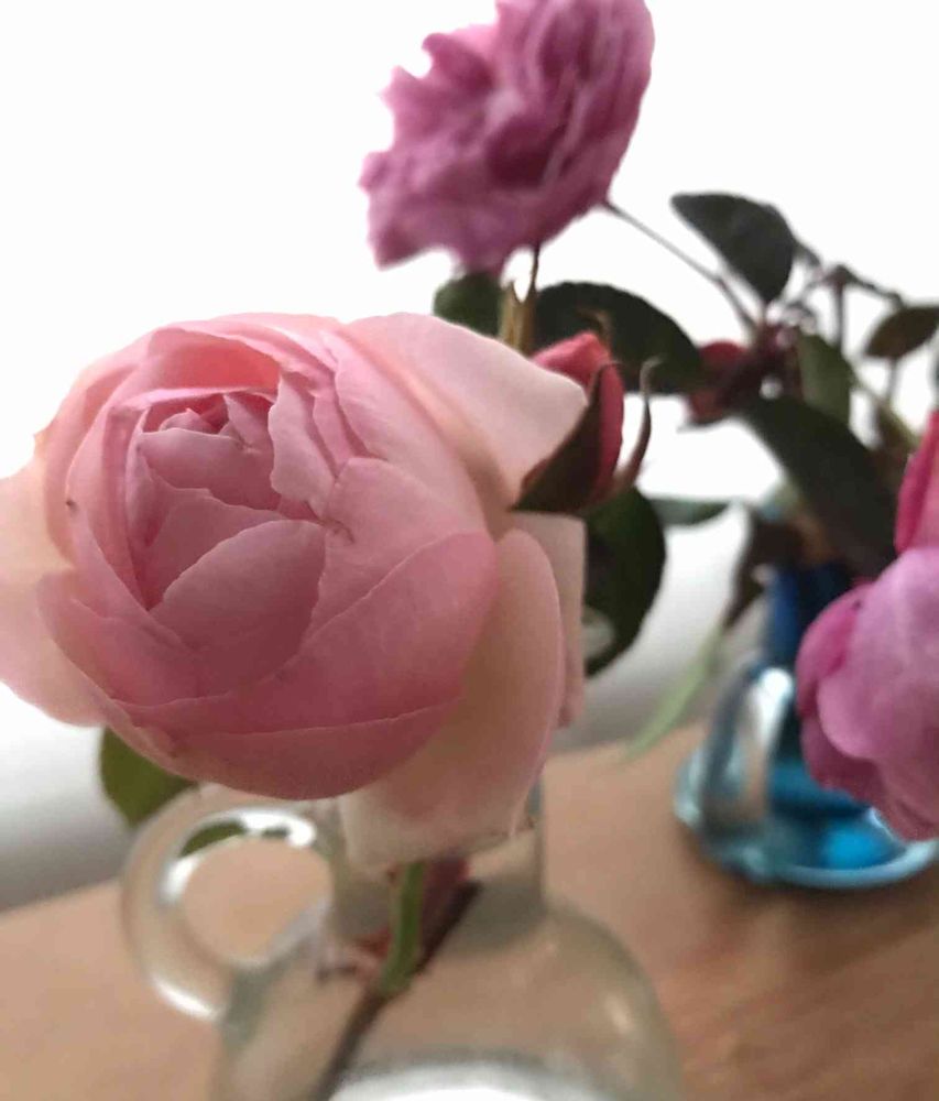 今年は、かなり思い切った剪定をしました。ツボミ1輪、水に挿したらなんとも可愛く開きました。この位がとっても好きなんです✨