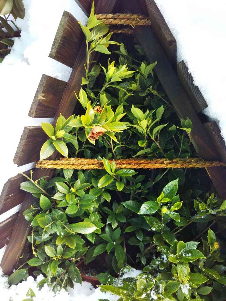 くちなしの木、花芽をしっかり付けてます。両脇はびっしり雪🥶で締まりました。天気☀️が良いから、落雪注意しながら囲い点検くちなしの「緑」見ると安心します。👀保養です🤗