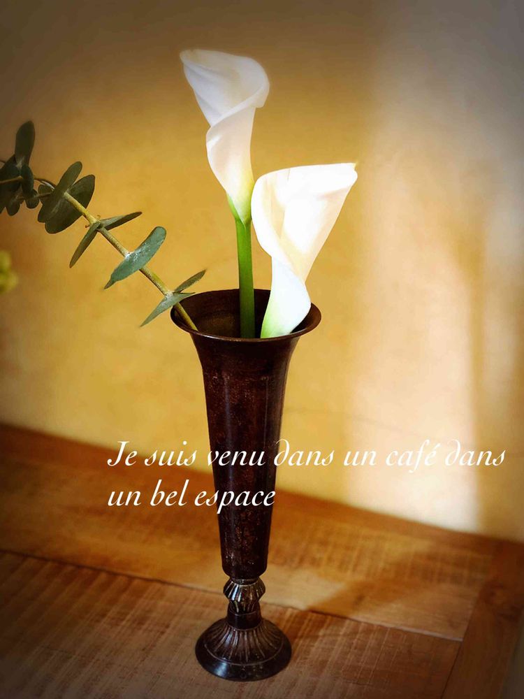 思い出のカフェに私の思い出も重ねてみたくなるカラーのお花でした。🌼🌱🌿🌺🍃🍂