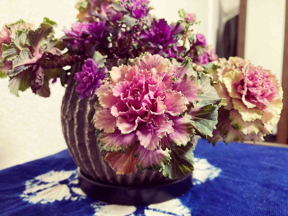 最近入手した葉ボタンが可愛くて、お昼はベランダで管理しながら、夜は家に入れて巣篭もりしてます。