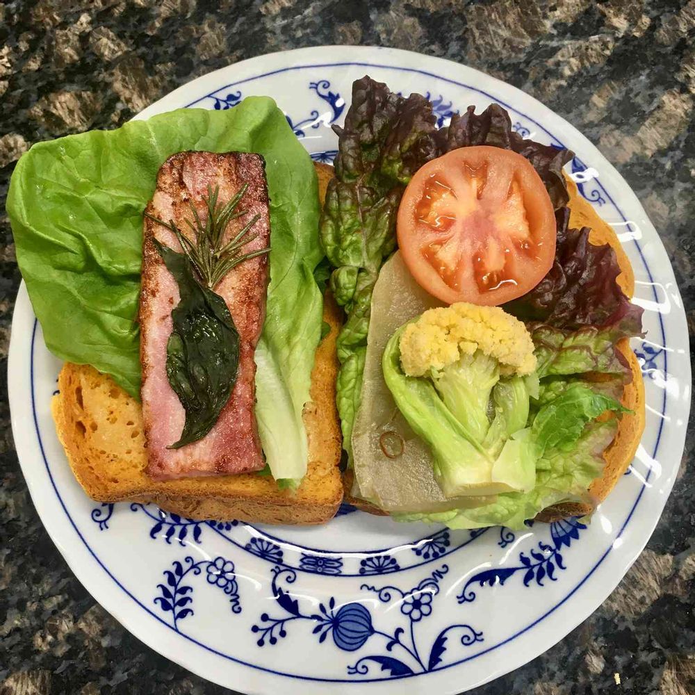 サニーレタス、太胡瓜ピクルス、トマト、オレンジカリフラワーと、サラダ菜、焼きベーコン、ローズマリー、スイートバジルのサンドイッチ。鶴首南瓜練り込みパン使用。