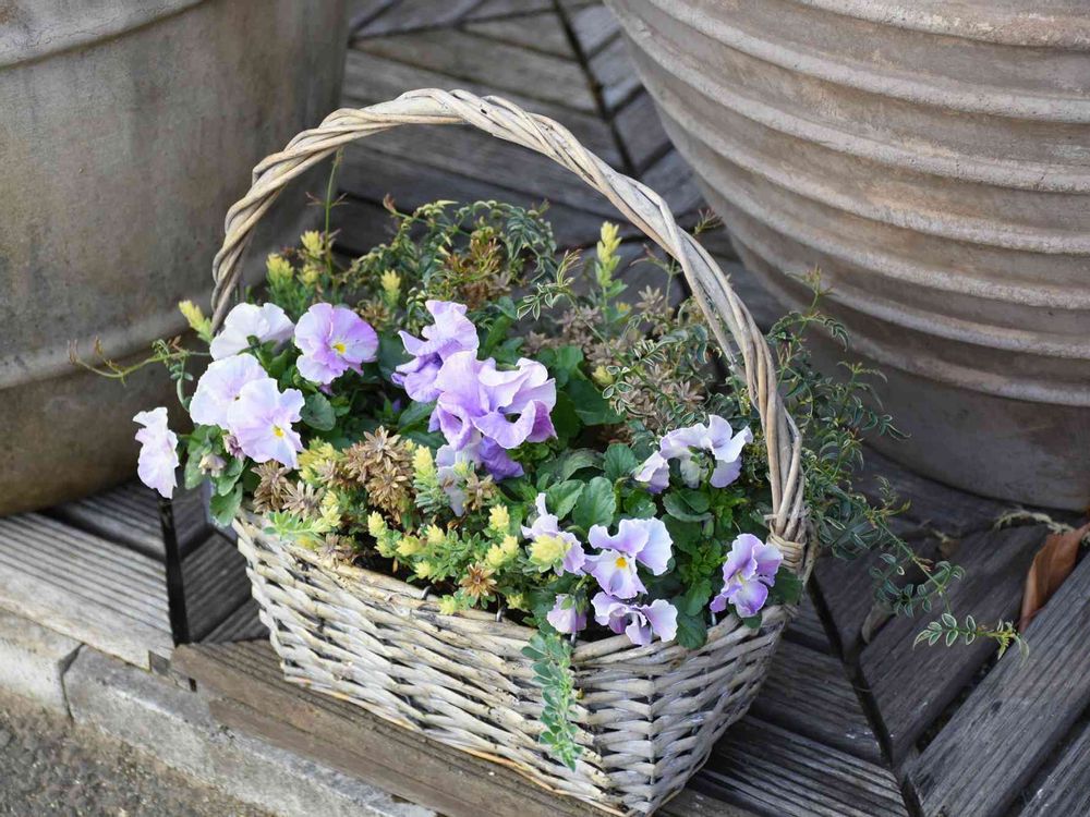 パンジー、ビオラ、斑入りハゴロモジャスミン、オーストラリアンローズマリー、ロータス ブリムストーン