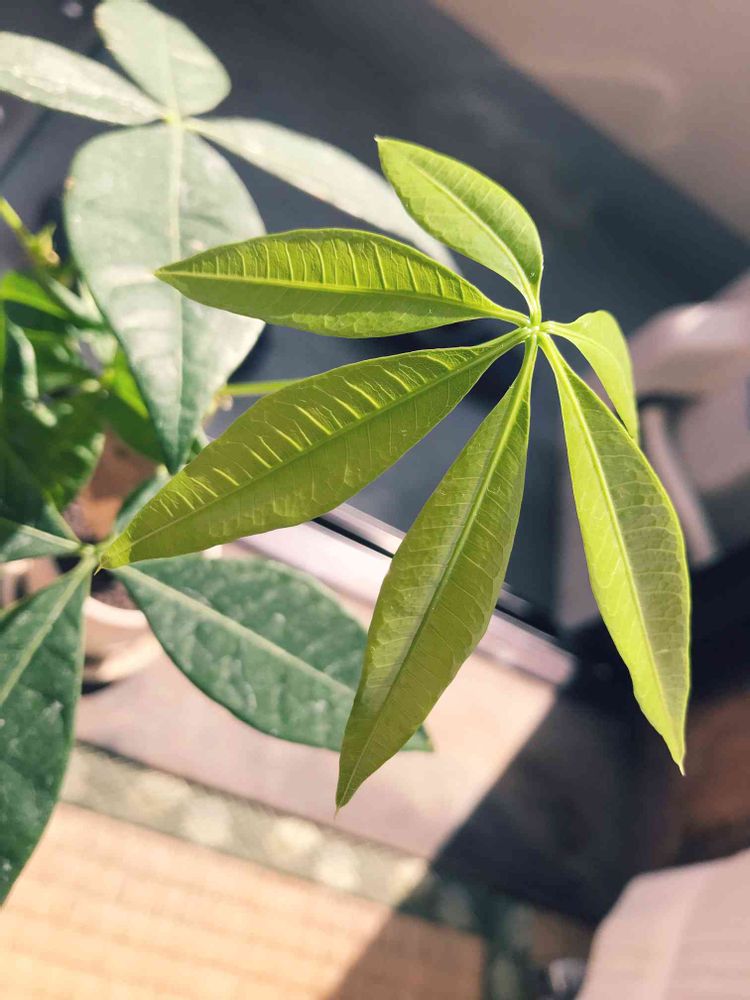 最近育て始めたパキラの新しい葉っぱの色が他と違くて可愛い!