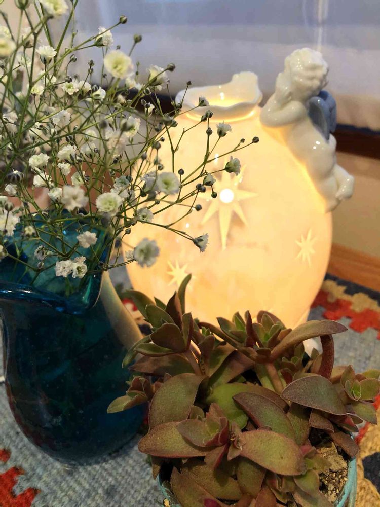 これはね、妹からなんかの返礼でもらったものでね、ランプの上にアロマオイルを入れるようになってます。なかなか、見た目も可愛いでしょ( *´艸`)ムフッずいぶん昔のものだけど、デパートにあったような🤔