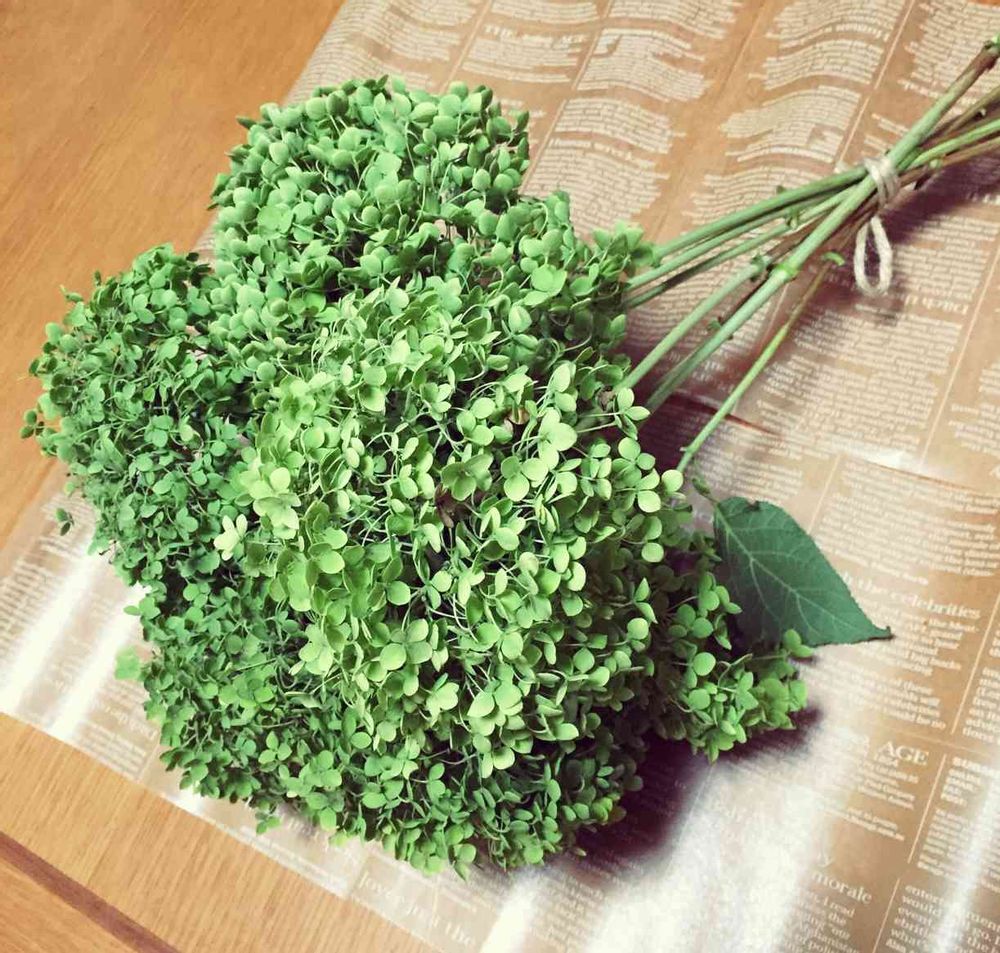 実家の庭に咲いていた真っ白だったアナベルが、ずっと咲かせっぱなしでドライになっていて綺麗な黄緑色になりました。