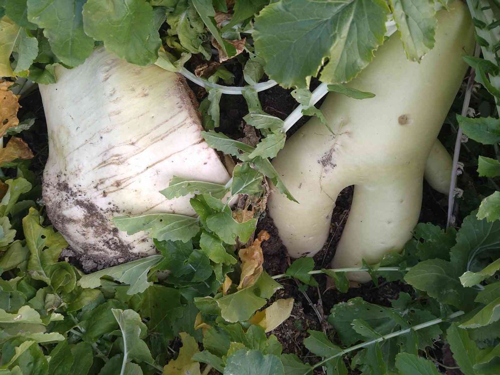 左 幅20センチくらいあるぺちゃんこの大根。横側が裂けてました!どうしてこうなった?!