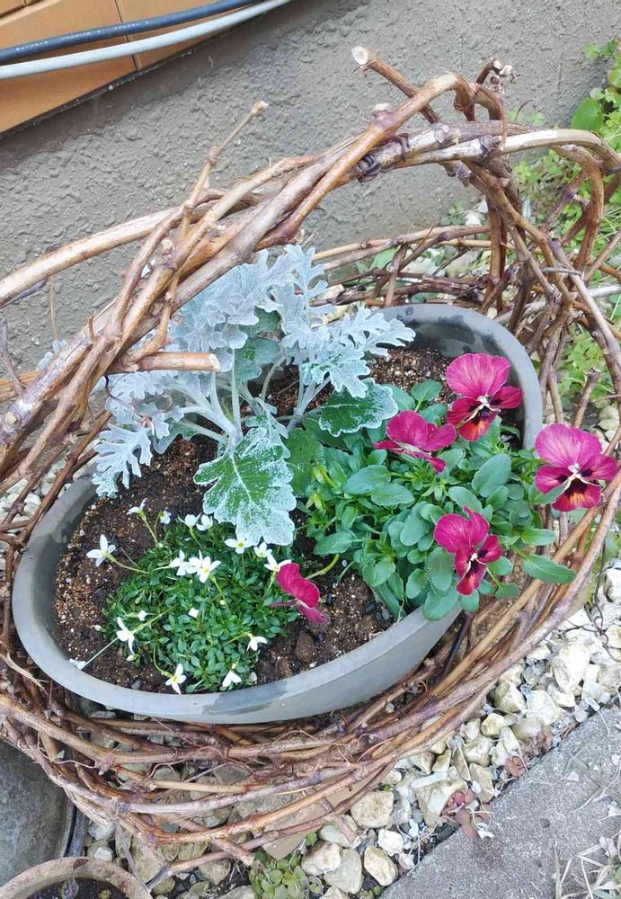 ヒナソウとアンティークビオラとダスティーミラーで、寄せ植えにしてみました😊