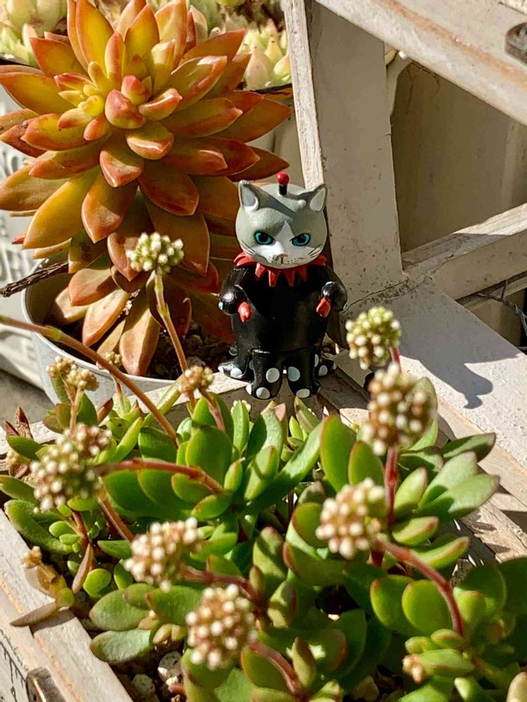 凛々しい🐈猫ちゃんですね。エケベリア紅稚児ちゃんですか💗❔orクラッスラですか❔その違いもわからず多肉生活に、目覚めています😆。お花…開花ですか❔