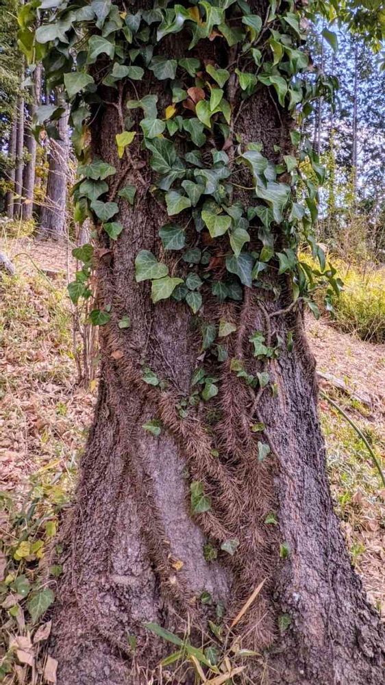 午前中に投稿したエノキをグングン上って行くキヅタの根元です。太く逞しい…これは何?根?
