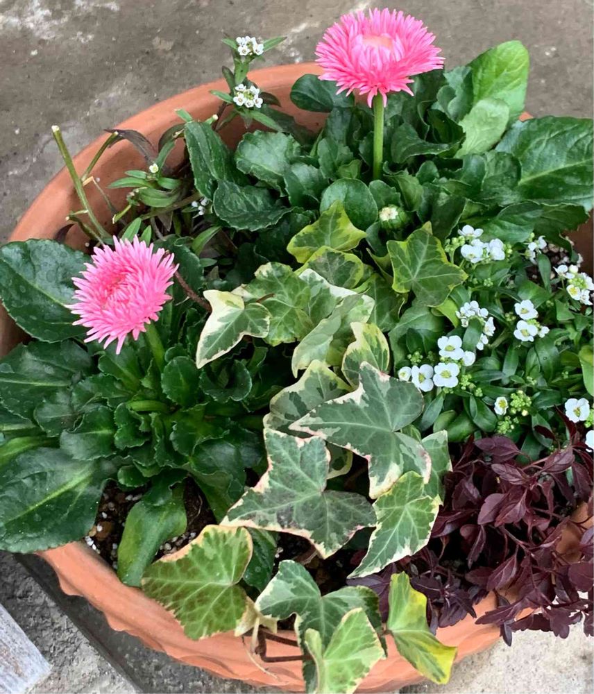 かわいい花の苗を見つけると、ついつい家にあるリーフたちを使って寄せ植えにしてしまうんです😅