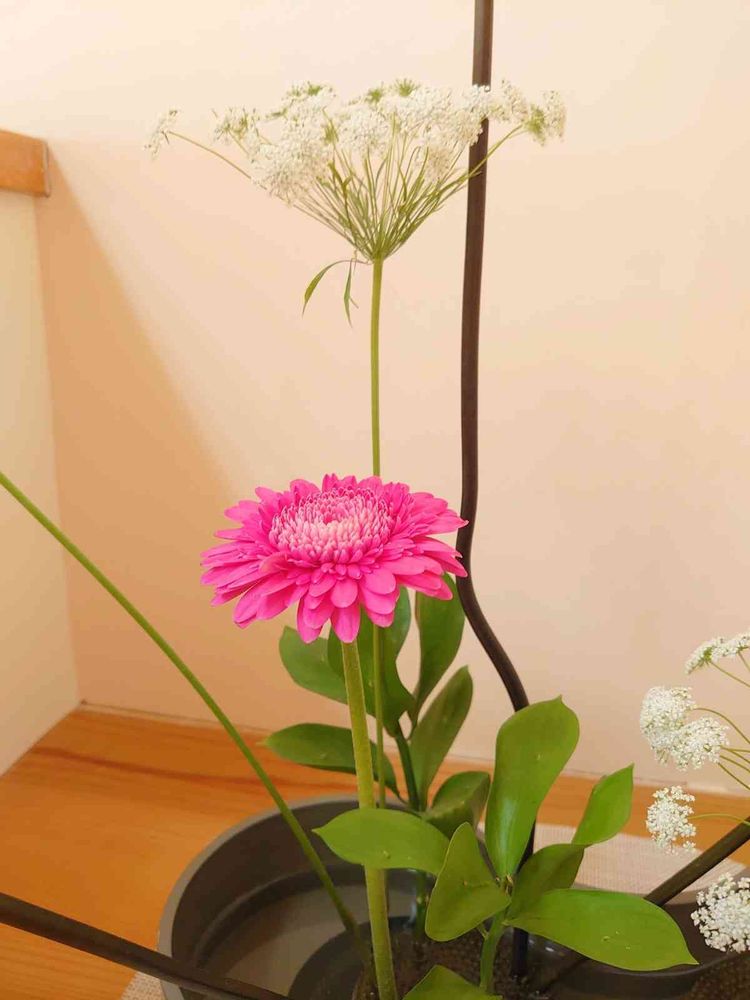 前回投稿した友達へのプレゼントにも白いガーベラを入れたので、お花屋さんで包む前に針金をお借りして刺しておきました。
