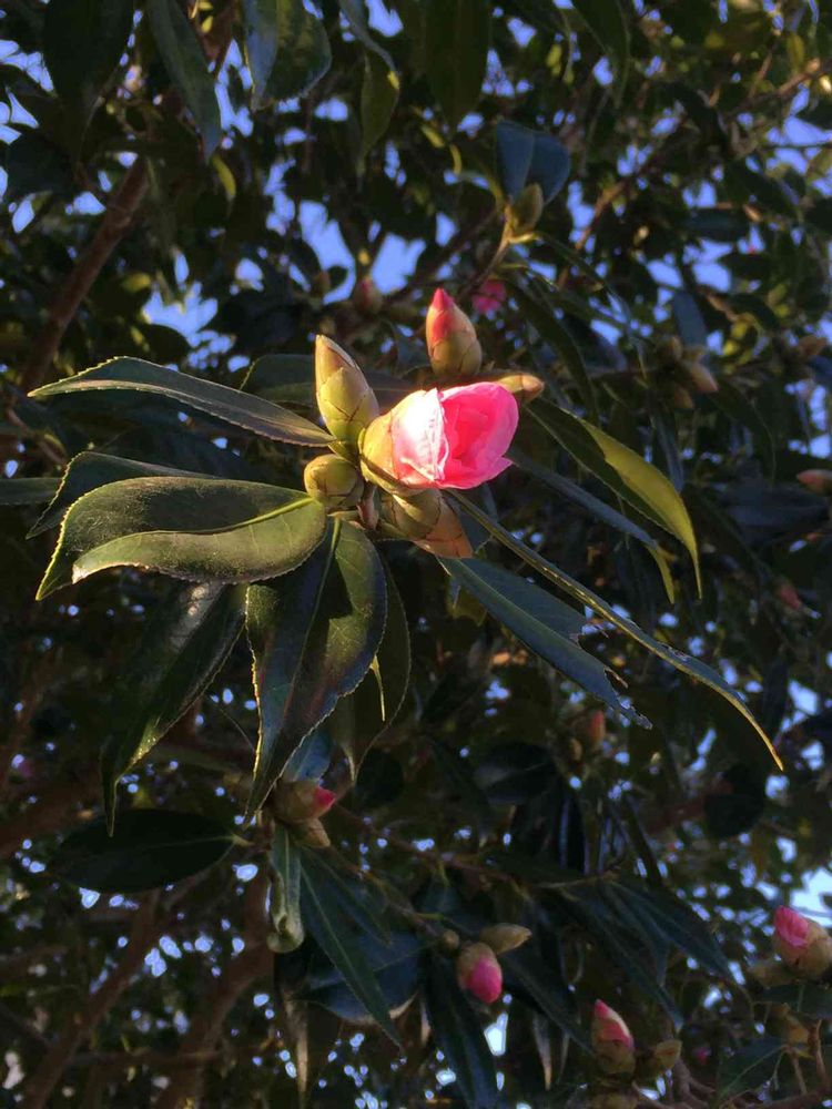 椿?寒椿?葉の縁がギザギザなので寒椿かな…神社のそばに咲いてます、開くのが楽しみ🥰