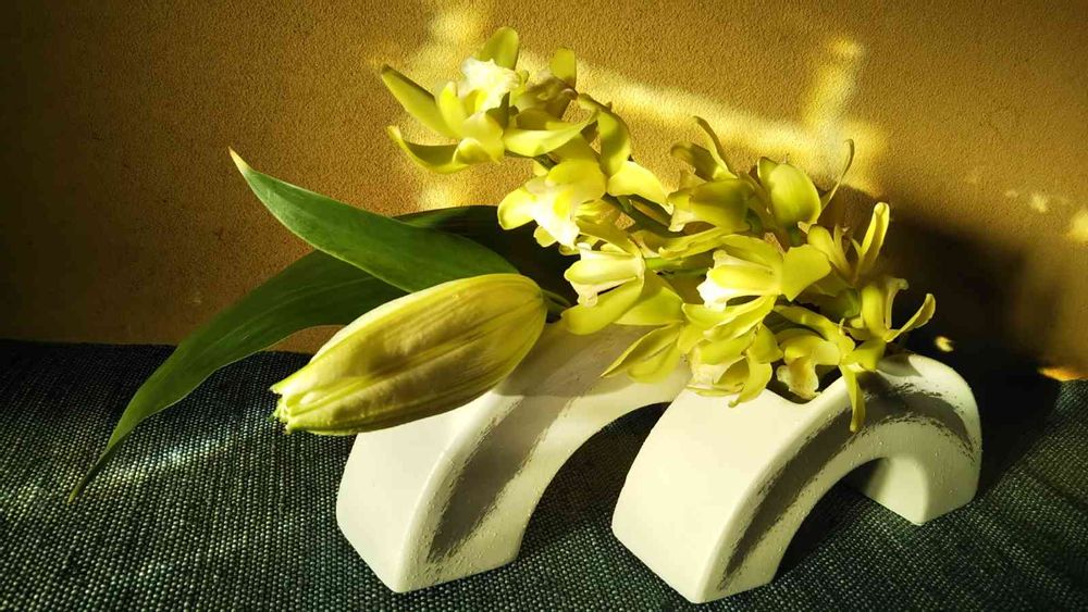 朝日が差し込み百合、シンビジュームさん黄金色に輝いて