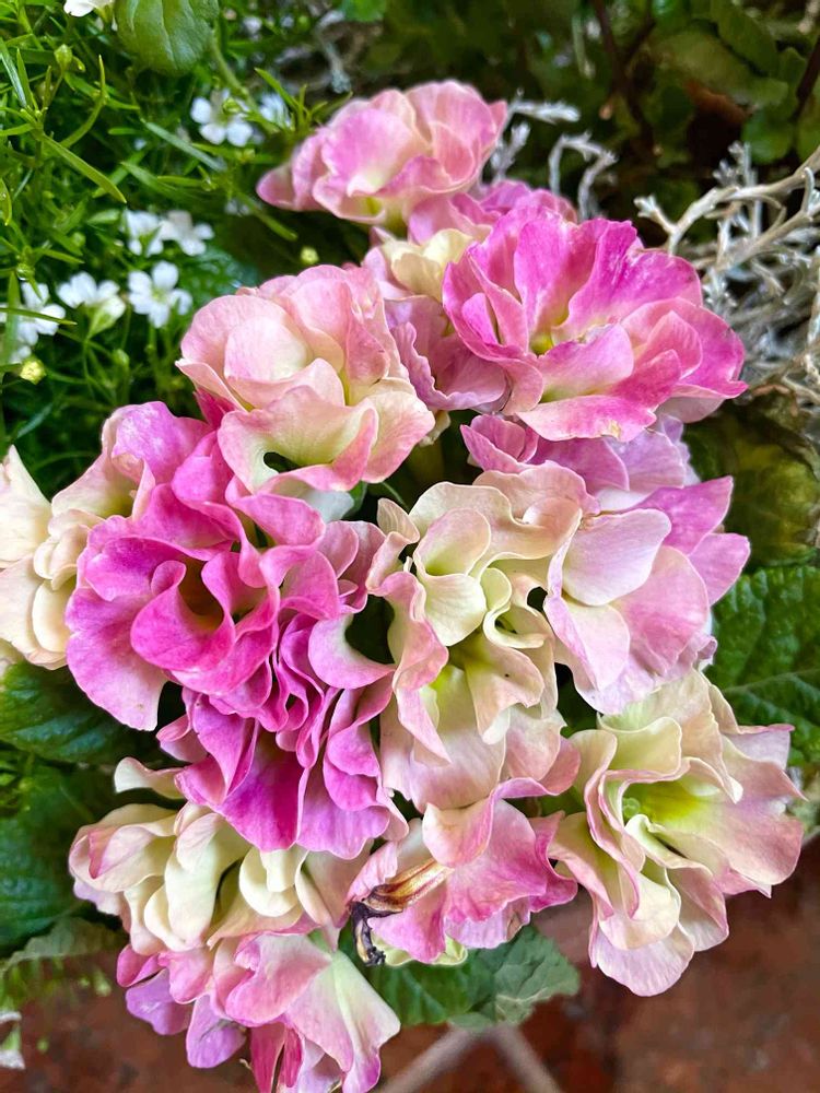 寄せ植えの中のフリンジ咲きジュリアンモンシュシュ🌸花数を保ってたくさん咲いてくれています。寒波で玄関に避難していた時に撮りました📸