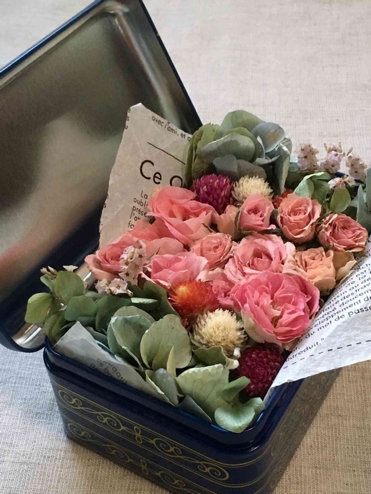 チョコの缶にお花ギッシリだね