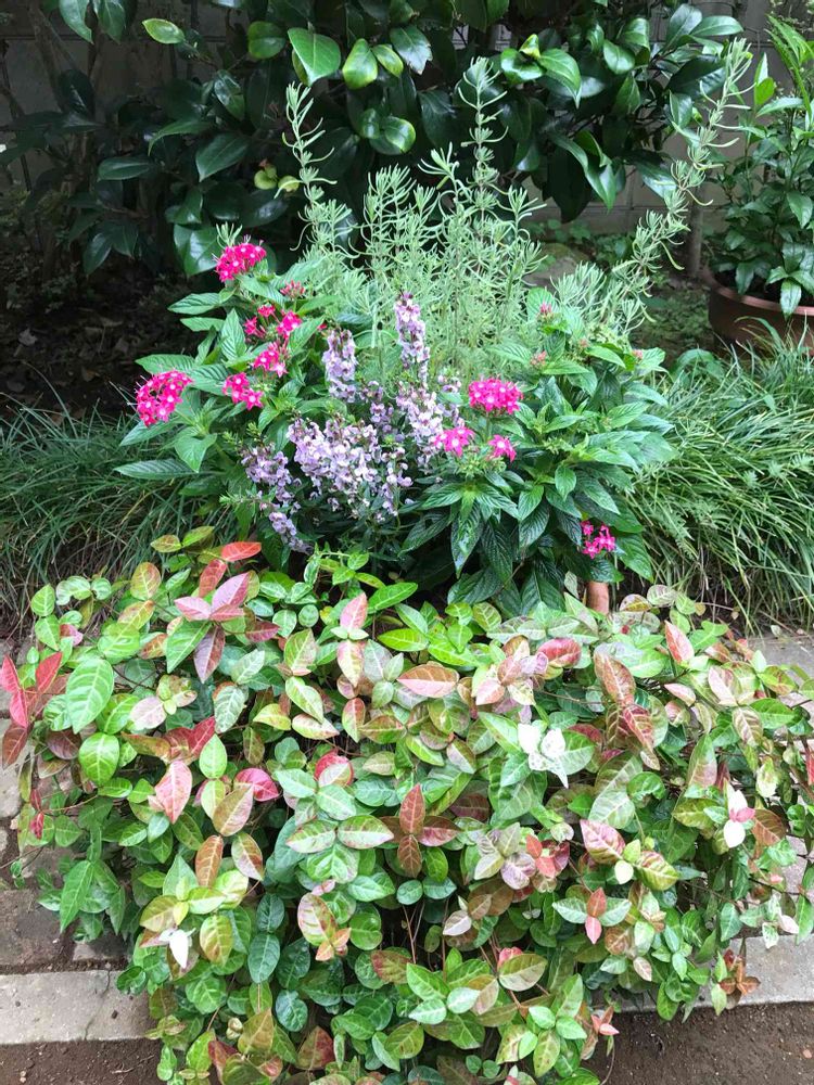 アンゲロニアと ペンタスで 寄せてみましたぁ! 手前の ハツユキカズラは もう 何年も植えたままで 引き抜くこともできない💦