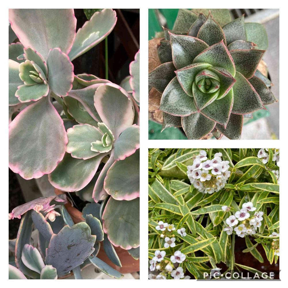 こんにちは、☔️止みませんね🤣ゆっくり出来ますが外も気になります、🏷錦の日参加させてください🙋♀️⬅️カランコエ リンリン↗️大和錦下葉は焦げてます😅↘️スーパーアリッサムモリモリ雨に打たれてますが元気ですよ🙋♀️