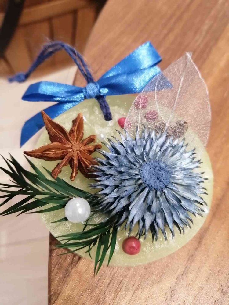 このブルーのお花、いつか使ってみたくてどんな感じに使おうか、悩んで悩んで出来た作品でした。