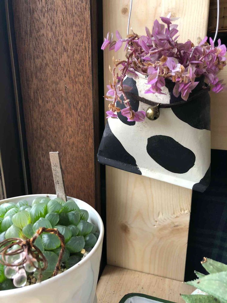 今年は冬越しが上手くいって、元気もりもりなので、株分けして牛柄リメ鉢にもin