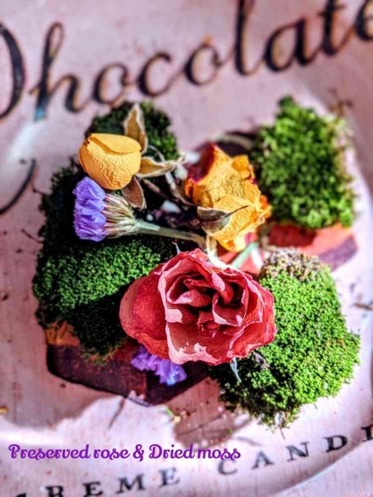 一皿の上のプリザーブドフラワー🌹+モス🟢のプレゼンテーション🤭薔薇と苔デザートは如何ですか? ちょっとキッチンテーブルの上で遊んでみました。🤗💖