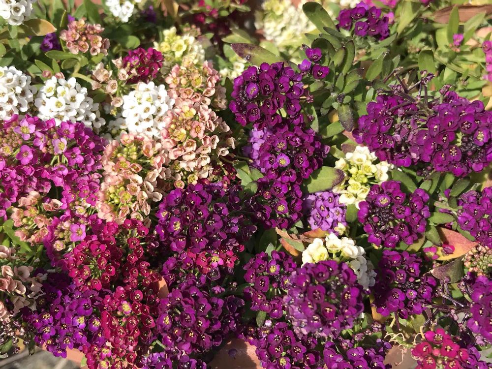 ご近所の鉢に色とりどりのスイートアリッサムが!