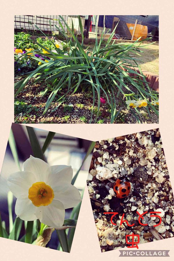 この前の雪で倒れてしまった水仙が復活してきました❤️てんとう虫さんがいました🐞