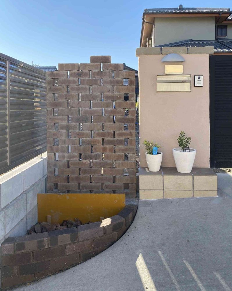 勾配になっているので、レンガやタイルの角度を測っての切断、施工に四苦八苦😣
