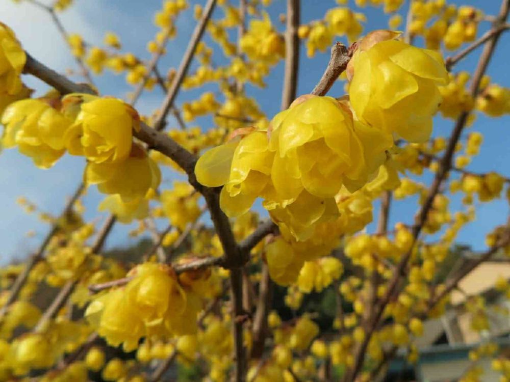 散策路沿いの庭先、青空のもと満開の素心蝋梅が甘い香りを漂わせていました。