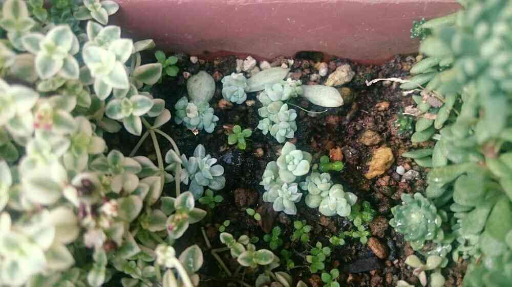 リトルミッシーとグラウコフィラムの隙間に置いといたプロリフェラ錦の葉挿し、夏の間も暑さに負けずに少しずつ大きくなりました♡