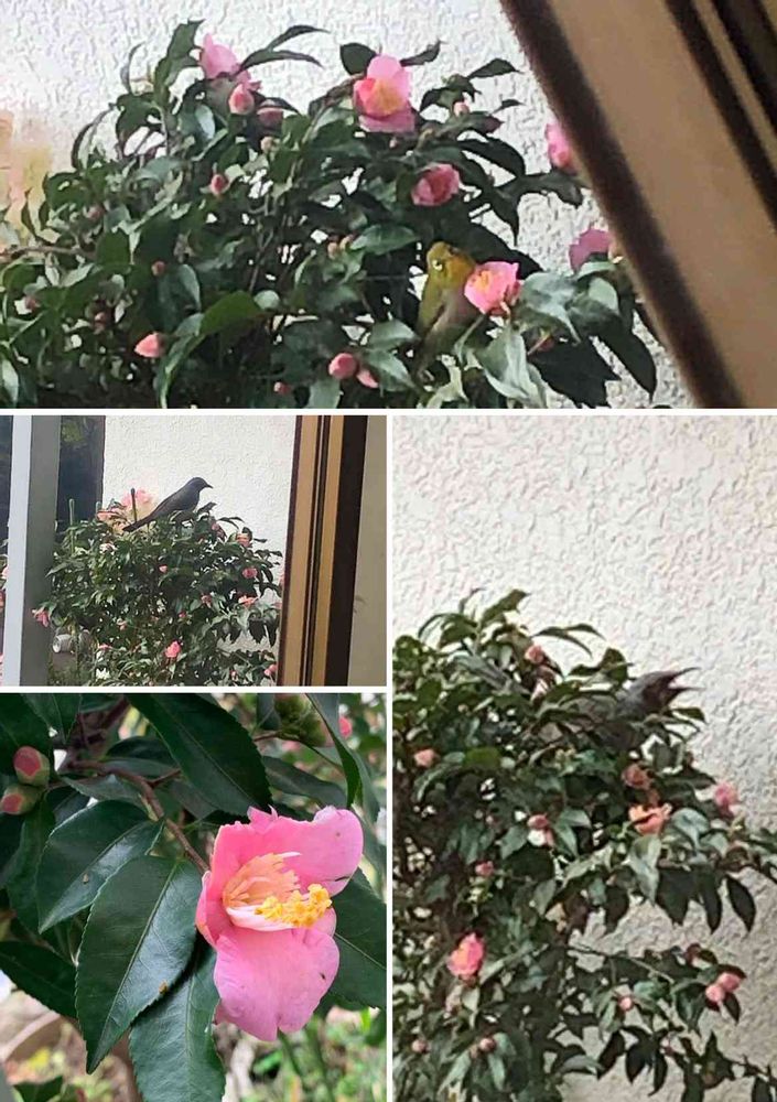 メジロ🐦が咲き出した姫椿をツンツン😚