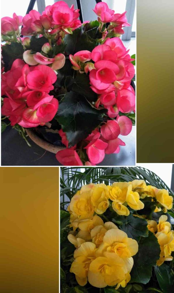駅ビルのピンクと黄色のリーガースベゴニアの花、可愛いです💕