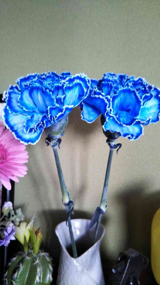 カーネーションの💙色も美しいですね花弁の濃い💙がさらに美しさを引き立てます・:*:・(*´エ`*)ウットリ・:*:・こちらは暖かい日となりましたが 黒ねこさんの方も若干寒さ緩んでますかね💕素敵なお迎え魅せて頂き🐜が10です🎶.•*¨*•.¸¸♬