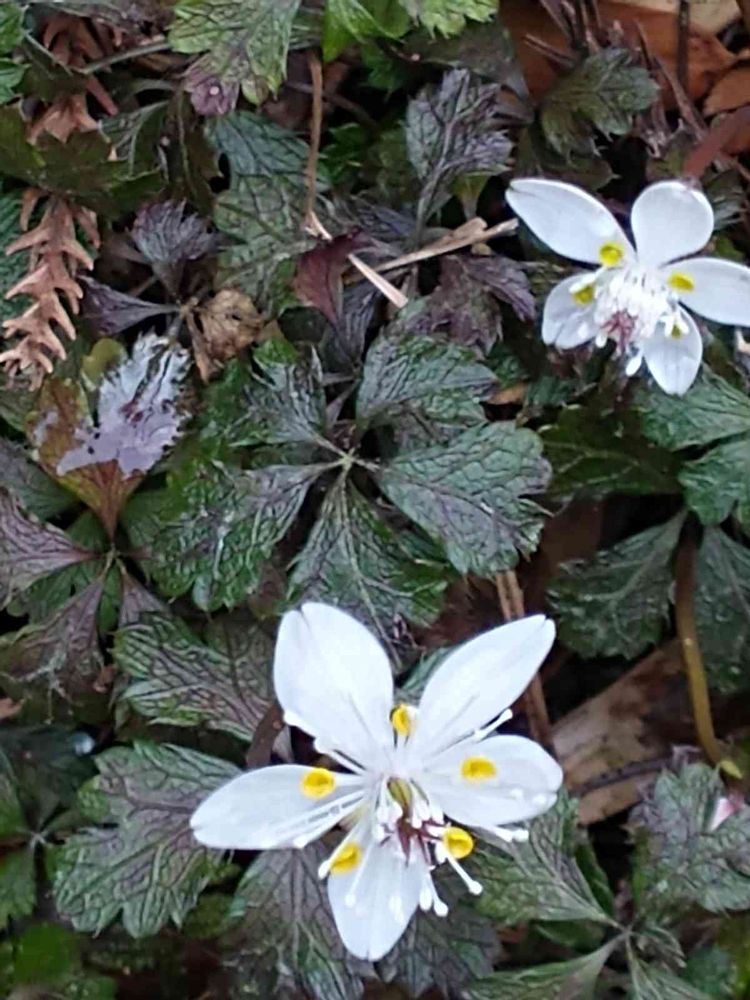 バイカオウレンの白い花が 木立の下で