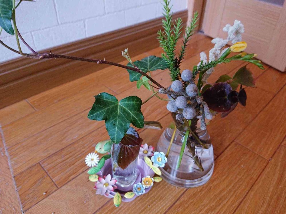 お花のサブスクで、月に2回、500円程度のミニ花束が💐届きます。その中で枯れずに残っているものや、我が家の八重咲きベゴニアを合わせて飾っています。灰色のバーゼリアは、子どもたちに『ナウシカの世界みたい☆』と人気です🌿