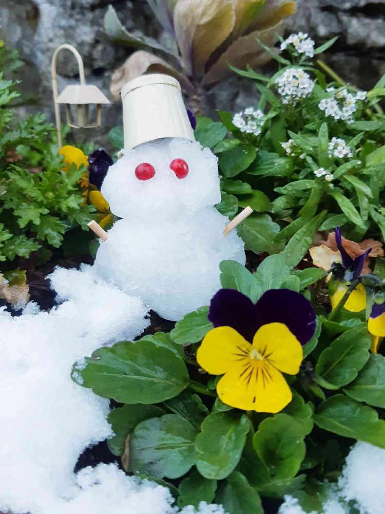 小さな雪だるま⛄がビオラ🌼とポーズ👀📷✨