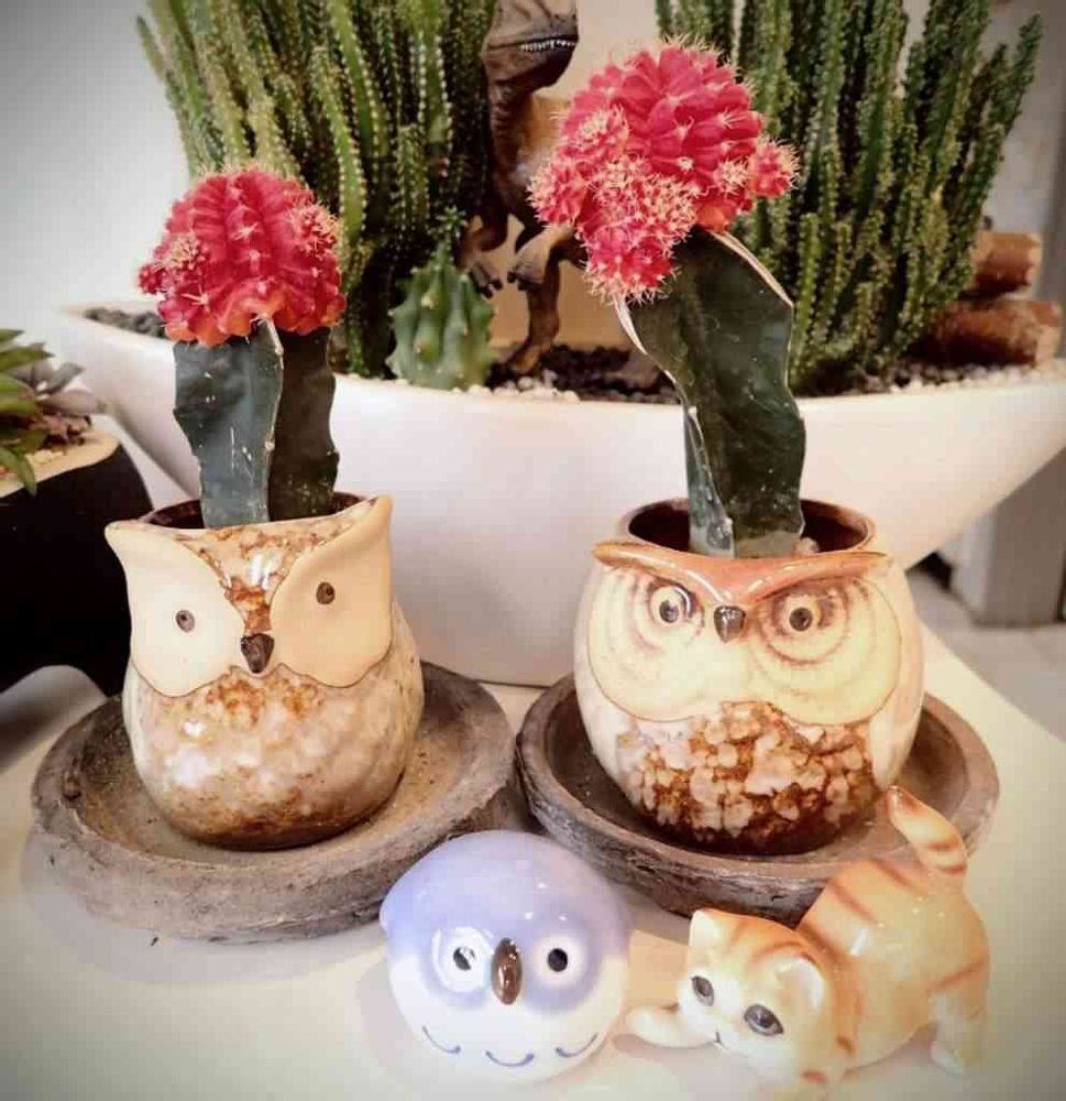 フクロウ祭に参加します🦉フクロウの夫婦鉢が可愛くて買ってしまった緋牡丹です😅向かって左が雄のフクロウで、右のちょっとふっくら目のほうが雌だそうです。真ん中の青いのは以前にも何度かご紹介した有田焼のフクロウです。木彫りのフクロウ7レンジャー(?)は↑のカバー画像にいるので今回はパスです~🙇♀️
