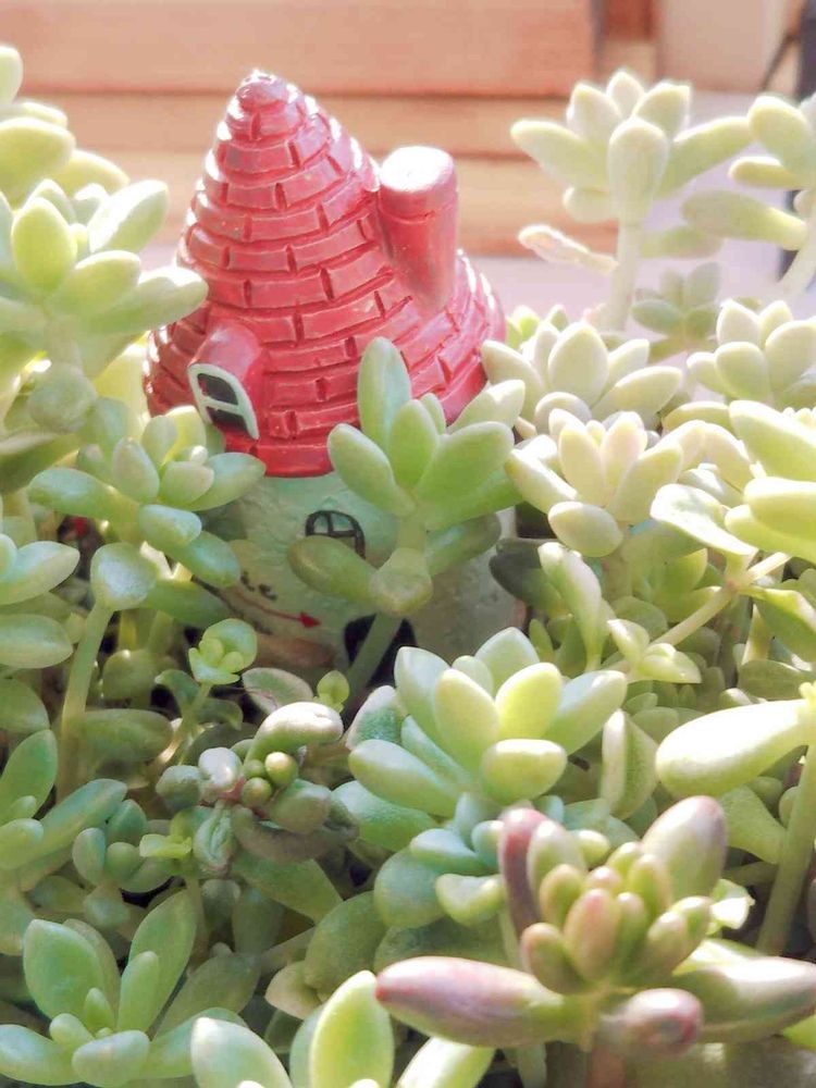 昨日の冷たい☔️もあがって、つぶつぶのセダムの森の赤い屋根のおうち🏡に明るい朝日が差してきました🌄