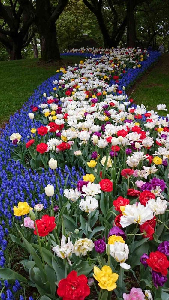 青いムスカリ天の川にチューリップが映えますね〜🌷🌷🌷🌷💙💙💙💙