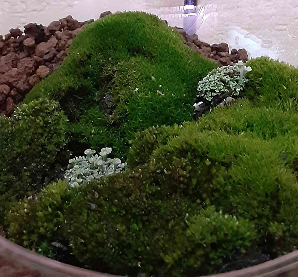 さん、私もガラス容器に苔と植物生けましたが、毎日眺めています。身近に苔が無い為、ホームセンターでスナゴケを買ってきましたが、フワフワで生けるのが難しかったです。父が庭に苔を植えていたので、苔には以前から興味があり、苔玉を作ったりしましたが、コロナでしばらくは帰れそうもないので。今は豆盆栽に、苔を張って楽しんでいます🎵苔、好きです‼