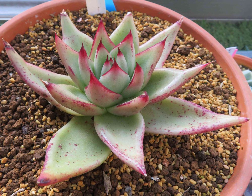 爪い赤がくっきりしてきたエボニーの実生株。中心部だけを見ると鮮やかな深い赤がきれいだけど,厳しい寒さのせいか外側の葉に赤いブツブツがいっぱい。