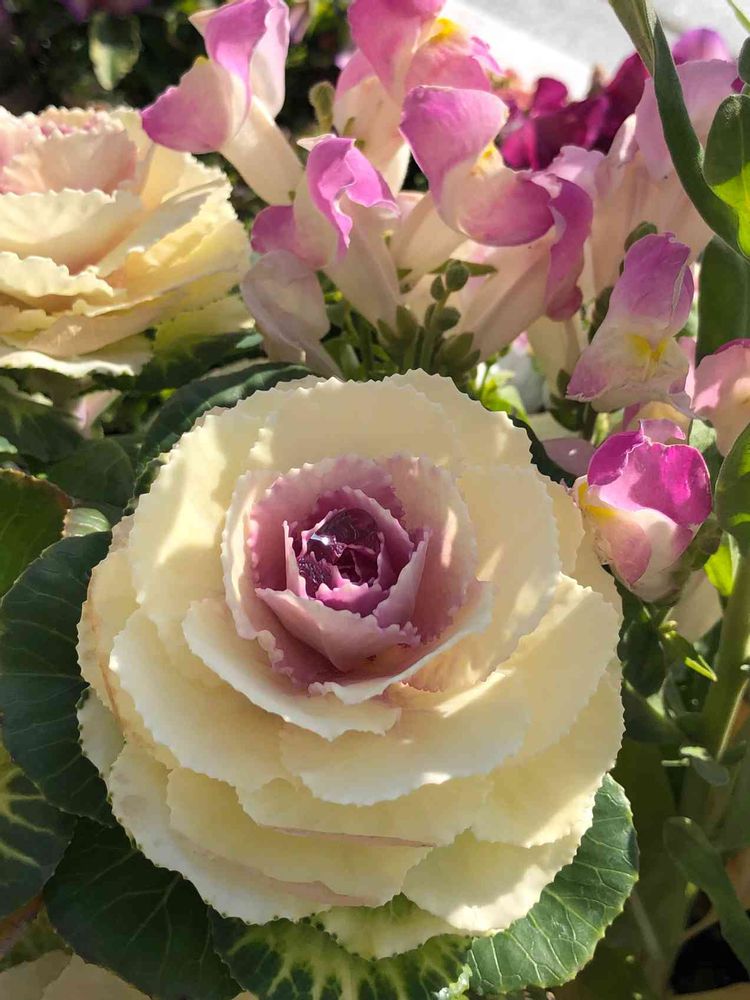 葉牡丹と金魚草の色のトーンが同系色にまとまっていて上品さがあふれている感じ…とても素敵✨☺️
