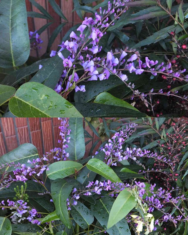 朝の通勤途中。「ハーデンベルギア」が綺麗に咲いていました。パチリ・パチリ
