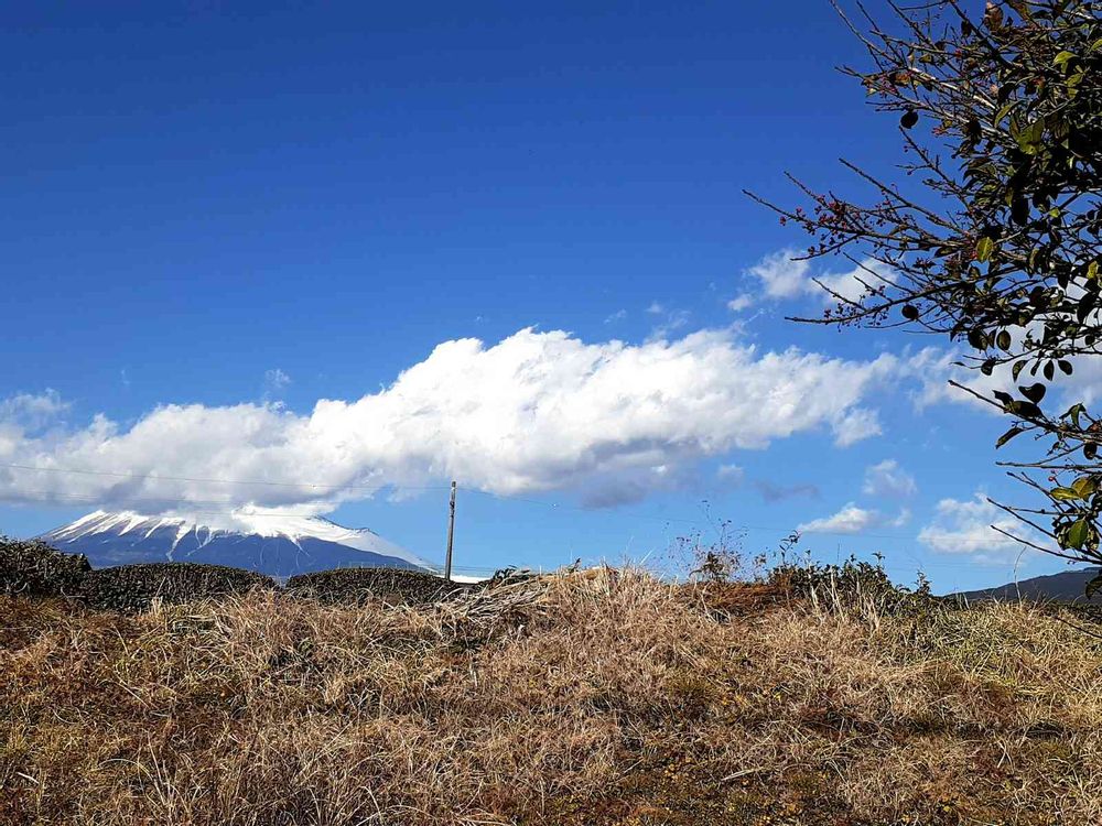雪の乗った富士山に白ヘビ雲みたいな真っ白な雲、面白い❣️