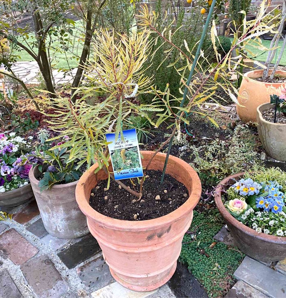 門柱前の花壇用に、和洋折衷、どちらでもいけそうと選んできたオージープランツ、バンクシア。