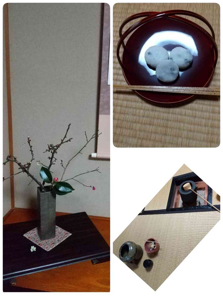和菓子は、豆大福、花は、庭の紅白梅と椿です。盆栽からの梅なんですが、紅梅は枝垂れ、ショボイです。なかなか大きく育ちません😅