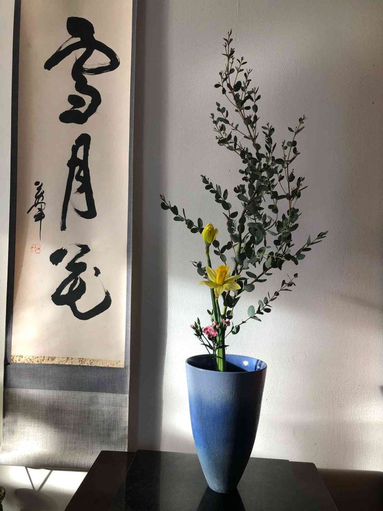 ユーカリですか?凄く優雅な枝振りで、水仙の葉がなくってもこんな素敵な花になるなんて…近づく春を喜んでるようですね😌💕