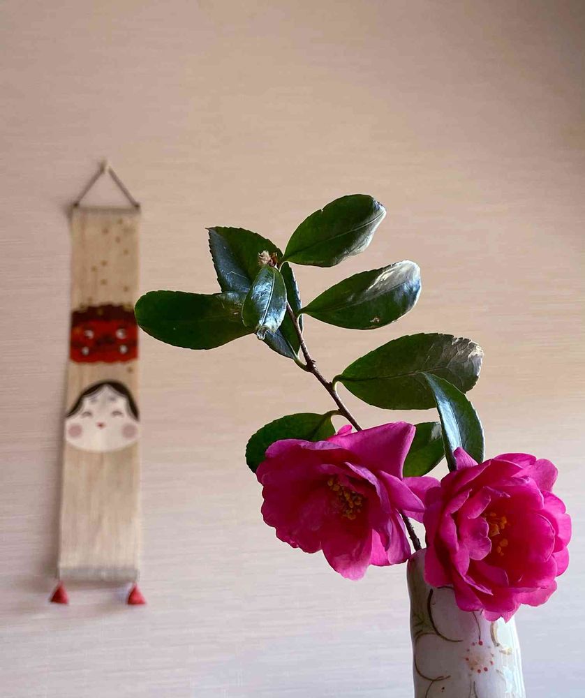 山茶花の華がツヤツヤしてて、お花もいいお色。タペストリーもコミカルな感じで。