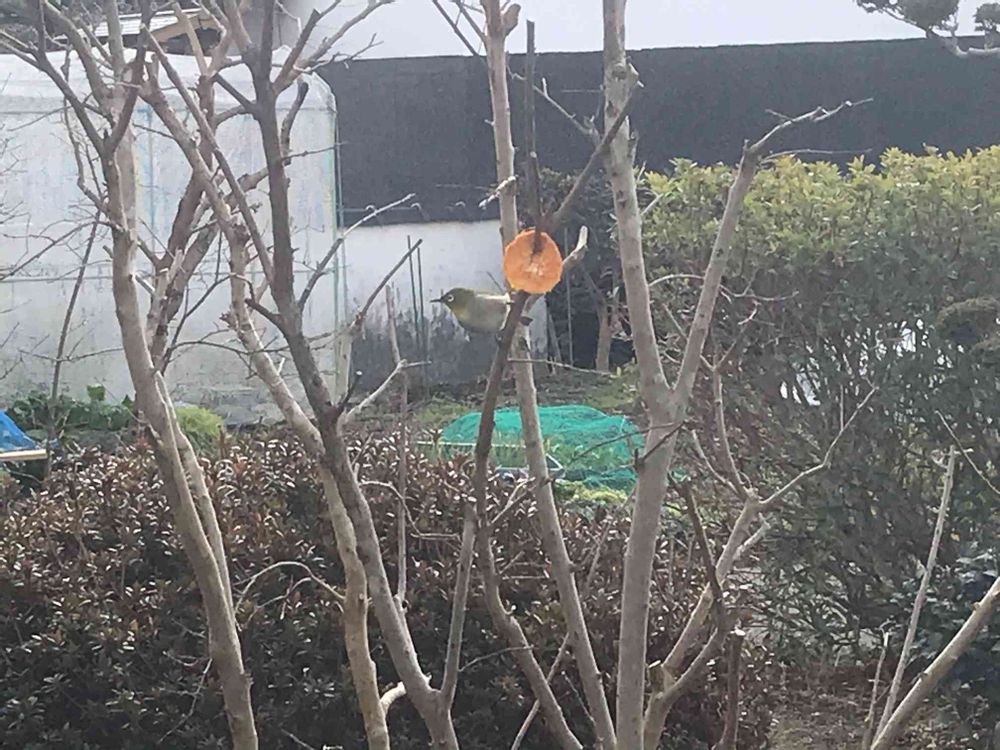 庭の百日紅の枝にミカンを刺したらメジロさんが来てくれました❣️