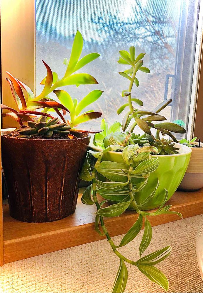 食器棚の片隅で眠っていたお気に入りだった食器に🥣可愛い多肉さんたちを植えて小窓に飾ってます🪴このところの暖かい陽射しが嬉しいご様子で陽が差し込む場所に向かって仲良く背が伸びてます🤗どこまで伸びるのかしら?😅💦