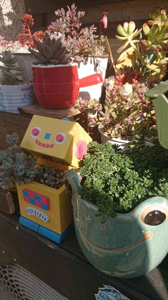少し前にカルディーで購入したロボット君(チョコレート入り)に穴を開けて多肉さんを植えました😆